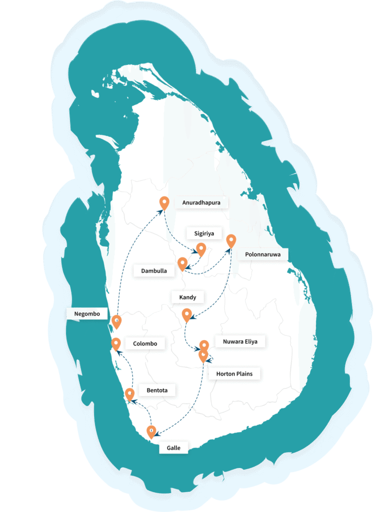 Negombo – Anuradhapura – Sigiriya – Dambulla – Polonnaruwa – Kandy – Nuwara Eliya – Horton Plains – Galle – Bentota – Colombo