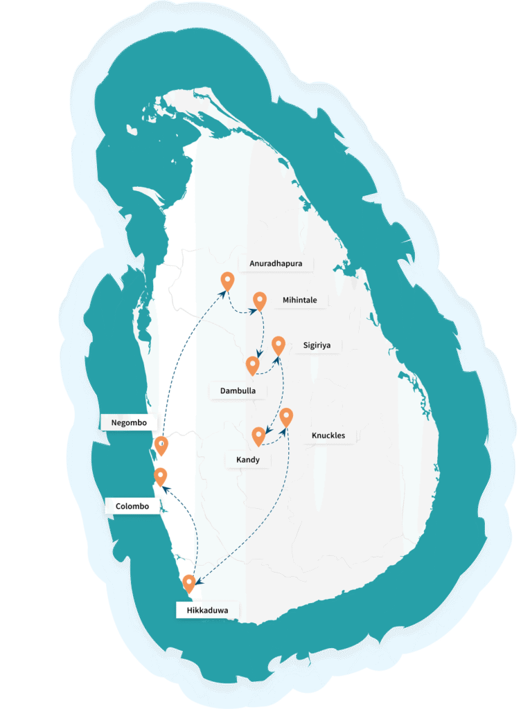 Negombo -Anuradhapura – Mihintale – Dambulla – Sigiriya – Kandy – Knuckles – Hikkaduwa – Colombo