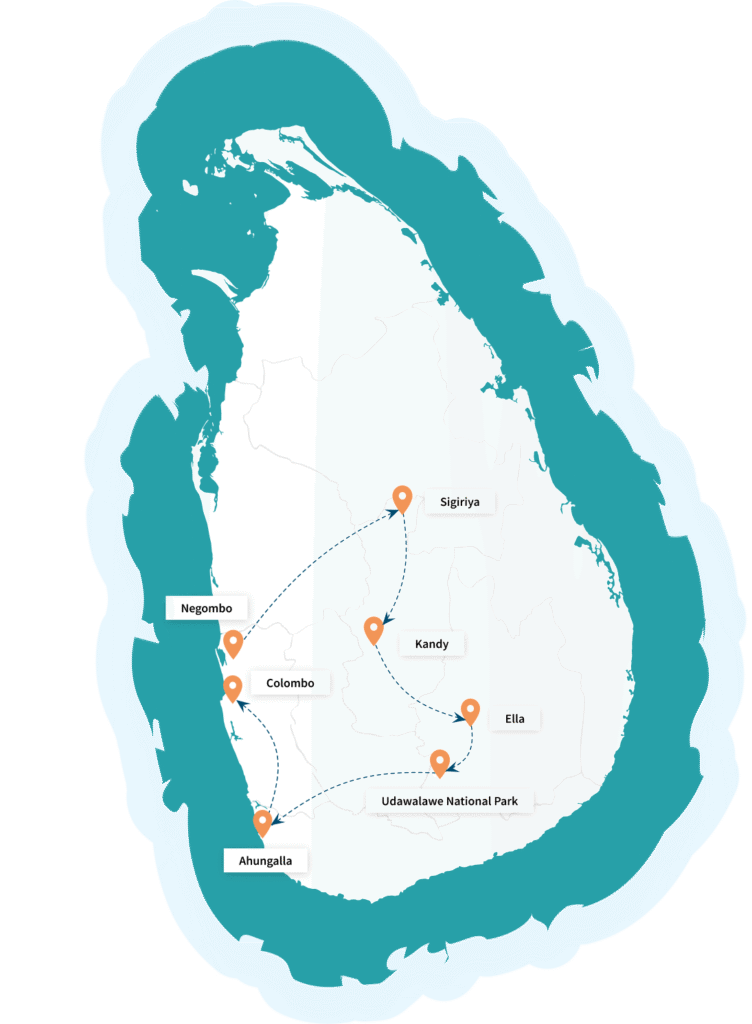 Negombo – Sigiriya – Kandy – Ella – Udawalawe – Ahungalla – Colombo